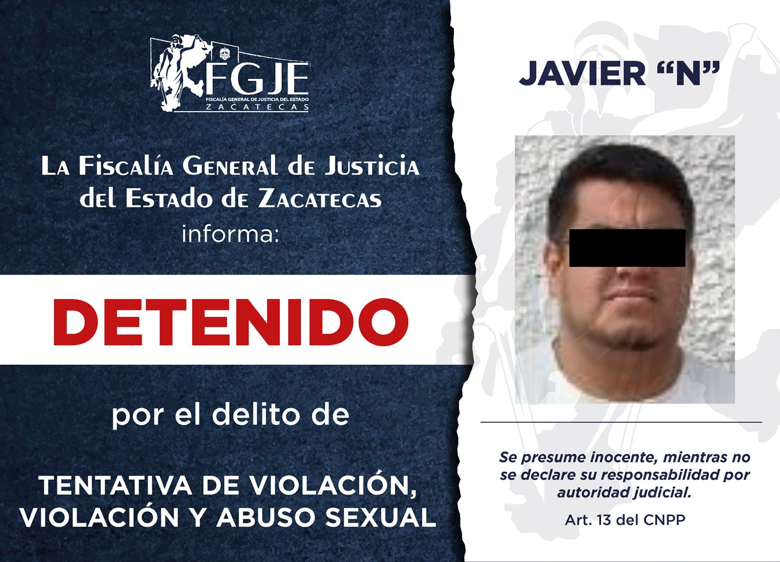 * Marcelo Magdiel “N”, fue detenido en el municipio de Tlaltenango, Zacatecas, contaba con una orden de aprehensión por el delito de violencia familiar agravada. * Javier “N”, fue detenido en el municipio de Saint Alto, Zacatecas, contaba con una orden de aprehensión por los delitos de tentativa de violación, violación y abuso sexual.