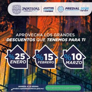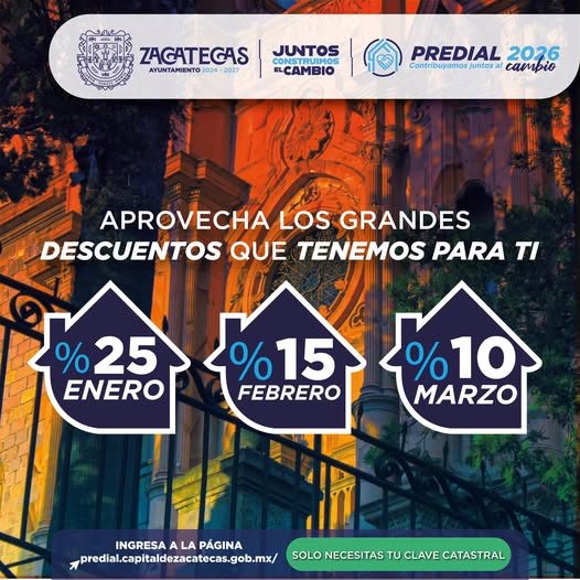 Con el firme compromiso de apoyar la economía de las familias zacatecanas y fomentar una cultura de cumplimiento responsable, el Ayuntamiento de Zacatecas informa a la ciudadanía que durante los primeros meses del año 2026 se aplicarán atractivos descuentos por pronto pago en el impuesto predial.