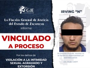 La Fiscalía Especializada en Atención de Delitos contra las Mujeres por Razones de Género, logró la vinculación a proceso de Irving “N” por los delitos de violación a la intimidad sexual agravado y extorsión en perjuicio de dos personas.