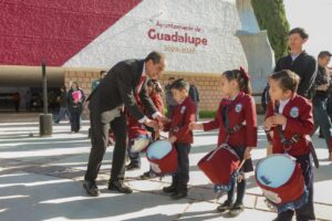 En ceremonia de honores a la bandera para conmemorar a nuestro lábaro patrio, el alcalde guadalupense aseguró, que entre las acciones que se llevan a cabo para estar cerca de la ciudadanía destacan, la rehabilitación de calles y carreteras en conjunto con el Gobierno del estado encabezado por David Monreal Ávila, así como la entrega de apoyos sociales, tales como tinacos, boilers solares y material de construcción, además de la atracción de la inversión pública y privada en materia de vivienda y cadenas comerciales.