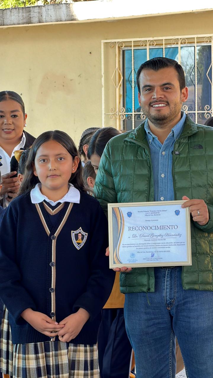 Recobrando un reciente compromiso adquirido en los recorridos por los diferentes centros escolares del XII distrito local que comprende Villa de Cos, Mazapil, Concepción del Oro, Melchor Ocampo, El Salvador y Nieves, el diputado local David González Hernández entrego a la comunidad escolar de la primaria Francisco García Salinas en Villa de Cos, de un juego completo de juegos mecánicos tradicionales.