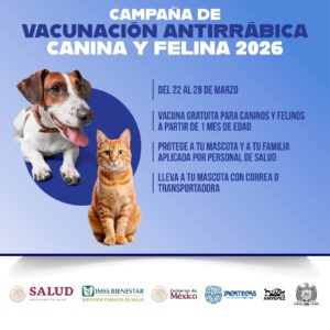 El Ayuntamiento de Zacatecas inició la Campaña de Vacunación Antirrábica Canina y Felina 2026, que se llevará a cabo del 22 al 28 de marzo en distintos puntos del municipio, con el objetivo de prevenir enfermedades y fomentar la tenencia responsable de mascotas.