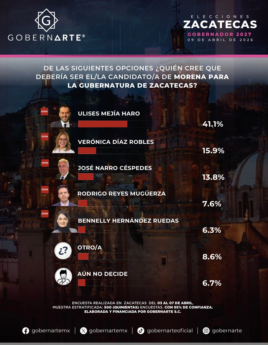 El nombre de Ulises Mejía Haro vuelve a colocarse al frente en las preferencias internas de Morena, según los resultados más recientes de la encuestadora GobernArte.